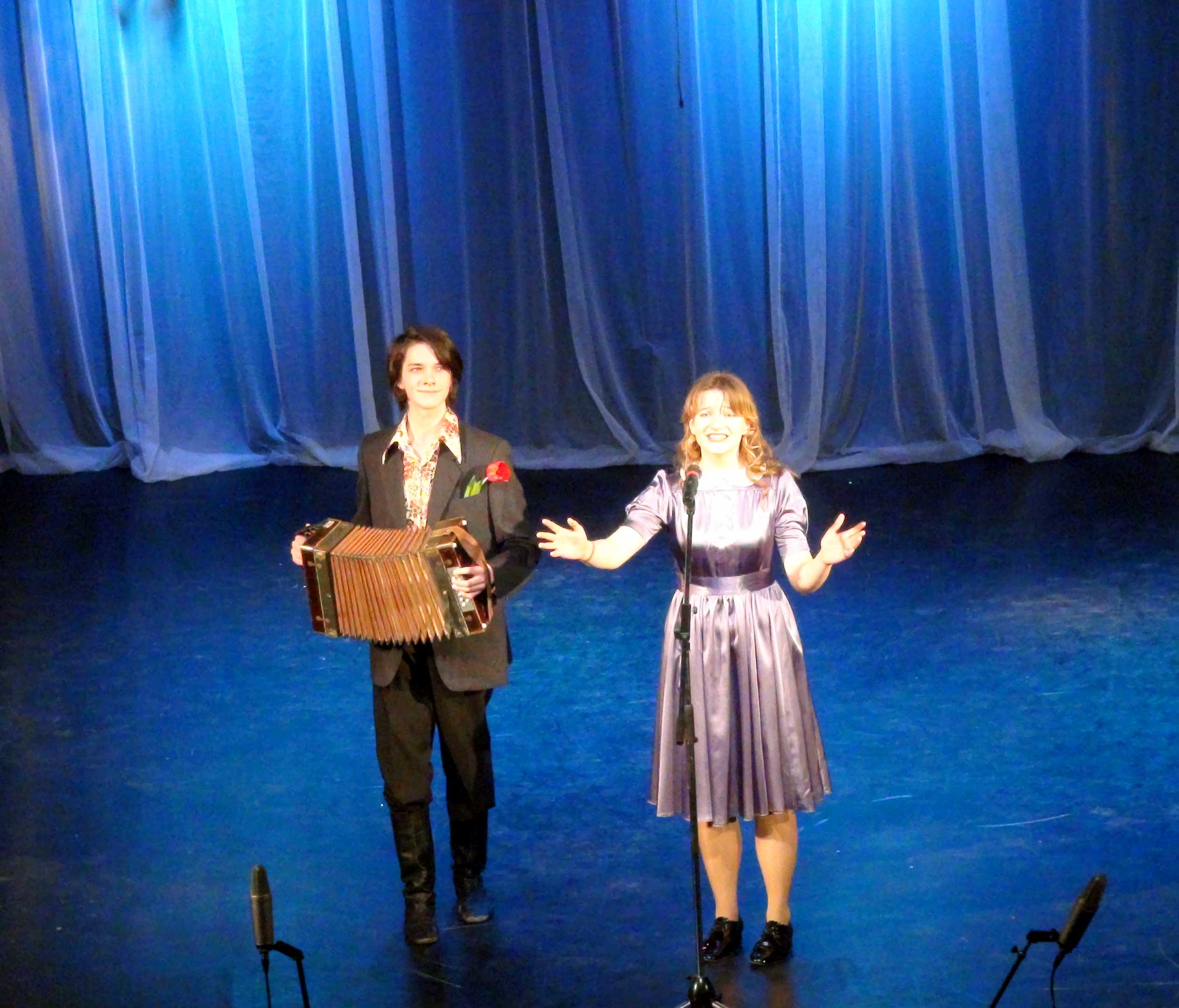 Совсем еще юные вокалисты и их старшие товарищи пели о мамах и бабушках, в исполнении учащихся студии «Страна чудес» прозвучал замечательный дуэт Тома и Бэкки на музыку В. Семенова. Со сцены звучали стихи Агнии Барто и забавные признания школьников о милых их сердцу шпаргалках. Отличительной чертой праздничного концерта было большое количество вокальных номеров, хореографических зарисовок на тему любви к родине. Выпускник нашей школы Дмитрий Рогозин замечательно исполнил песню «Шум берез», а юные артисты музыкально-драматической студии под руководством заслуженного работника РФ О.Н. Колинько развернули на сцене целое полотно, сотканное из музыки и танца, объединенное общей мыслью: «Россия - Россией останется!» Финальный номер в постановке А.А. Мухиной и Ю.Л. Романовой носил символическое название «Все вместе!» И это действительно так!